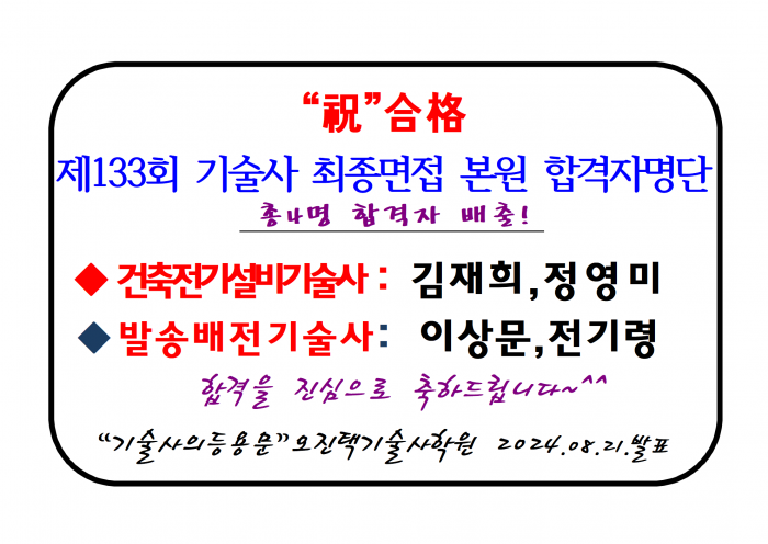 "경축" 제133회 기술사 최종면접 본원합격자 명단[2024년8월21일 발표]